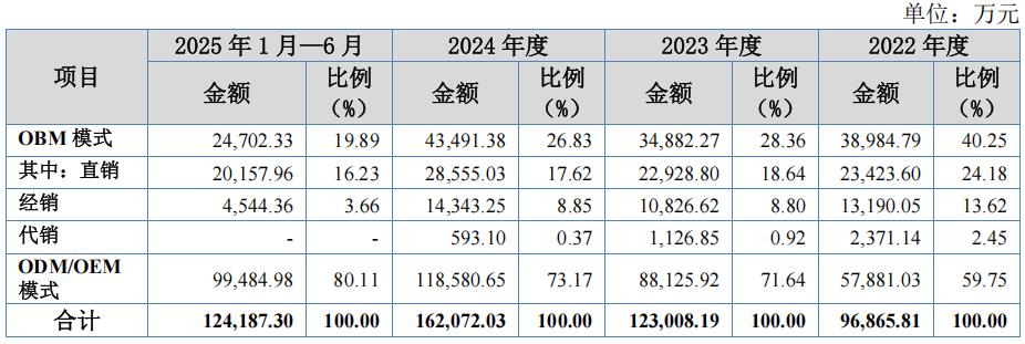 报告期内,欧伦电气ODM/OEM的销售收入占比分别为59.75%、71.64%、73.17%及80.11%,为主要的销售模式,该模式下客户主要为大型跨境电商企业和行业内或当地较为知名的家电品牌企业,2023年及2024年,公司ODM/OEM的收入增长的金额分别为3.024亿元及3.045亿元,2025年1-6月,公司ODM/OEM收入保持增长态势。