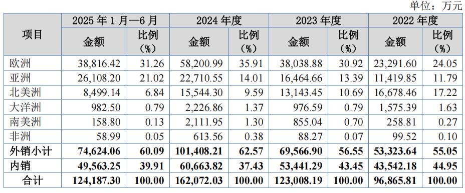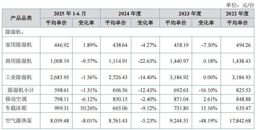 2023年至2025年1-6月欧伦电气移动空调销售收入增幅分别为40.15%、20.90%、51.24%,移动空调行业出口量在2022年、2023年有所回落;公司除湿机销售收入增幅分别为12.40%、33.65%、4.27%,增长主要源于外销,欧洲市场增加较快,但2022年至2023年中国家用除湿机对欧洲市场出口量持续下降,2025年1-6月,境内除湿机销量为530.8万台,同比下滑11.4%,2025年4月至8月,中国境外家用除湿机月销量同比下滑。报告期内,除湿机各类细分产品单价呈下降趋势,空气源热泵产品单价呈下降趋势。