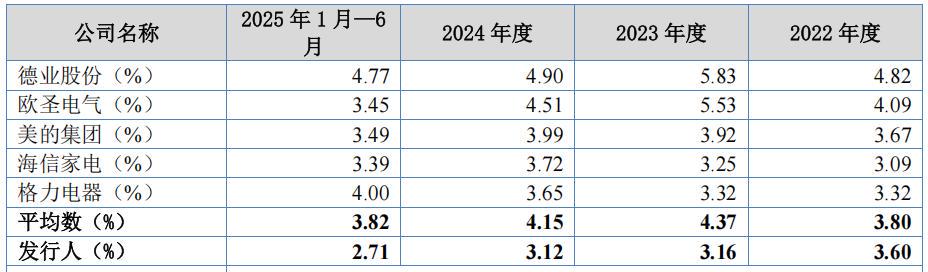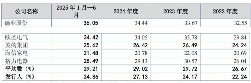 报告期内,欧伦电气综合毛利率分别为22.24%、24.17%、27.13%和24.86%,低于可比同行均值26.67%、29.72%、29.02%和29.21%。