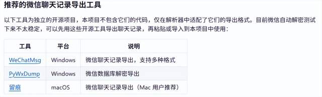 项目要求用户提供微信的聊天数据,并且还在项目上推荐了三款工具。