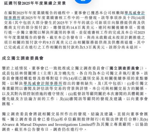 2026年4月2日,觅瑞(02629.HK)发布公告,披露了停牌背后的核心细节:审计机构毕马威在审核2025年年报时发现14笔、总额约1480万美元的预付款事项,其中已有约950万美元被相关服务方退还,剩余约530万美元为已完成或正在进行的工作相关的预付款。公司同时宣布成立独立调查委员会,委任律师行及专业机构协助审查。