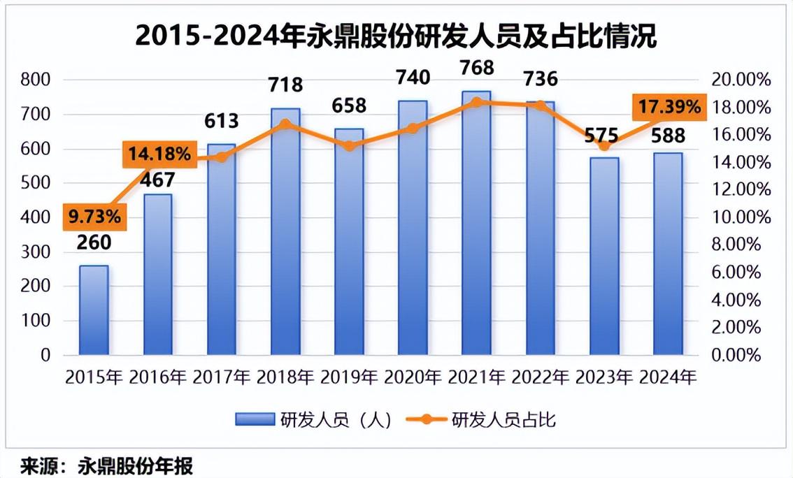2016年,永鼎股份研发人员从2015年的260人增加至467人,占比也从9.73%提升至14.18%;此后,公司研发人员占比基本稳定在15%-18%之间。