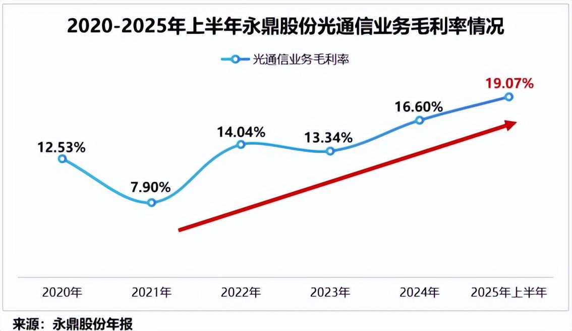 2021-2025年上半年,公司光通信业务毛利率从7.9%跃升至19.07%,足足提升了11个百分点。