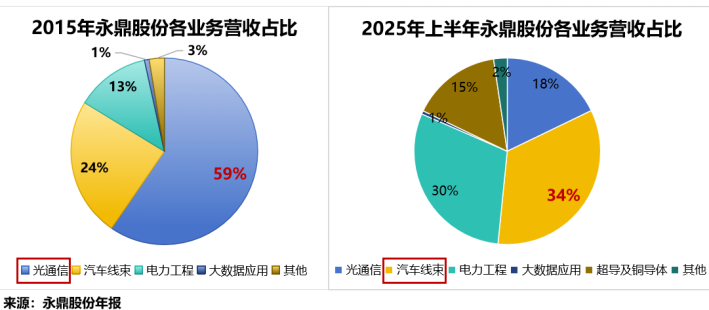 2015年,公司光通信业务占比高达59%,汽车线束仅占24%;而到2025年上半年,汽车线束占比已提升至34%,反超光通信近16个百分点。