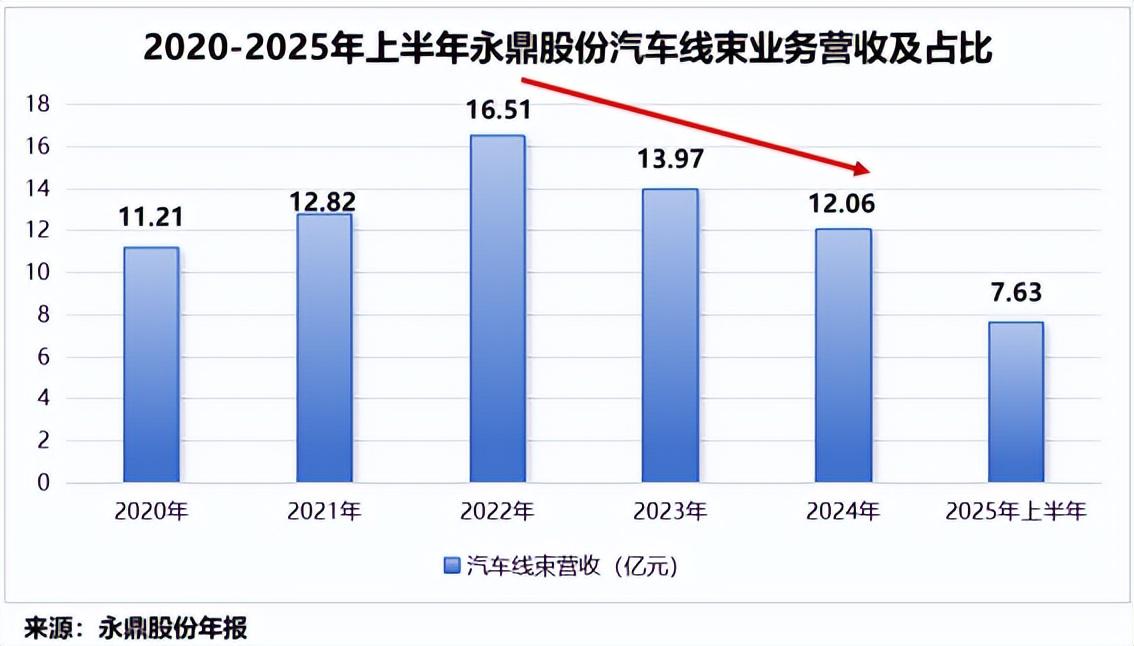2022-2024年,公司汽车线束营收从16.51亿元逐年下滑至12.06亿元;直到2025年上半年,该业务才迎来增长拐点,同比大增48.9%至7.63亿元。