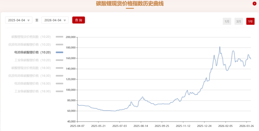 在全球锂矿产量收缩的背景下,碳酸锂价格走势备受市场关注。据第三方机构Mysteel数据统计,截至4月3日,电池级碳酸锂报价158000元/吨,相较于2025年下半年6-7万元的价格水平,已经实现超1.2倍上涨。