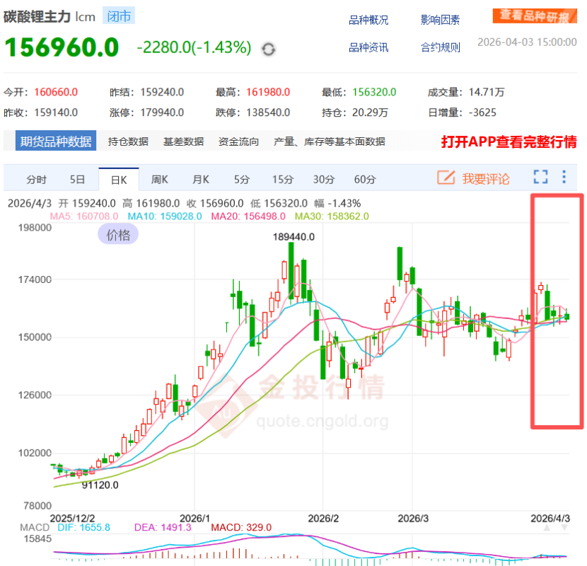 连日来,碳酸锂期货价格持续回调。截至4月3日,主力合约报收156960元/吨,跌幅1.42%。