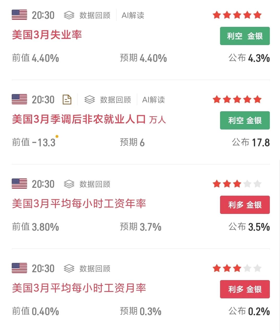 美国劳工统计局公布数据显示,美国3月非农就业人数增加17.8万人,大超市场预期的6万人,创2024年12月以来最高水平。3月失业率小幅回落至4.3%,市场预期持平于4.4%,显示美国就业市场仍有韧性。另外,美联储比较关注时薪环比为0.2%,低于市场预期。