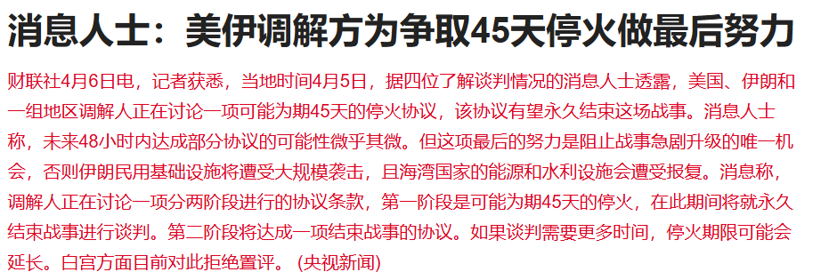最新的消息是,美国、伊朗和一组地区调解人正在讨论一项可能为期45天的停火协议,该协议有望永久结束这场战事。消息人士称,未来48小时内达成部分协议的可能性微乎其微。但这项最后的努力是阻止战事急剧升级的唯一机会,否则伊朗民用基础设施将遭受大规模袭击,且海湾国家的能源和水利设施会遭受报复。