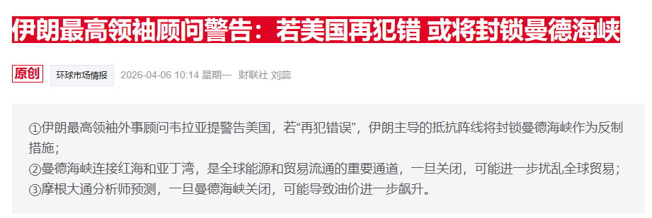 据报道,伊朗最高领袖外事顾问韦拉亚提5日警告美国,若“再犯错误”,伊朗主导的抵抗阵线将以封锁曼德海峡作为反制措施。此举或将对全球贸易和石油运输构成新一轮冲击。