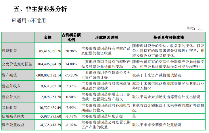 细分来看,投资收益为8541.6万元,公允值变动损益为3.04亿元,两者合计占利润总额的比例超过95%。
