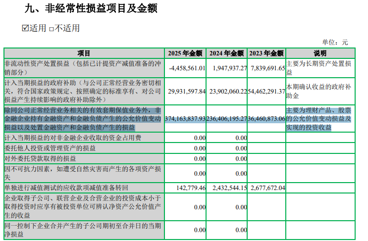 2025年,七匹狼非金融企业持有及处置金融资产、负债产生的损益为3.74亿元,主要为理财产品、股票的公允值变动损益及投资收益。