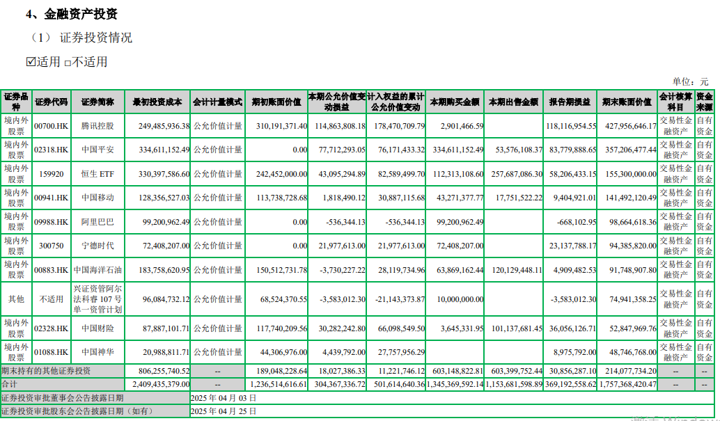 截至2025年年末,七匹狼持有的境内外股票等交易性金融资产的账面价值,达到17.57亿元,其投资的公司包括腾讯控股(00700.HK)、阿里巴巴(09988.HK)、宁德时代(300750.SZ)等。