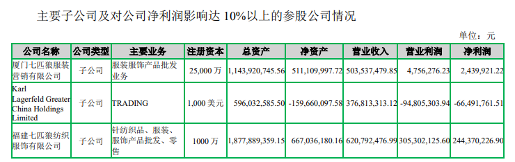 分品牌看,七匹狼自有品牌包括七匹狼、Karl Lagerfeld、七匹狼针纺。