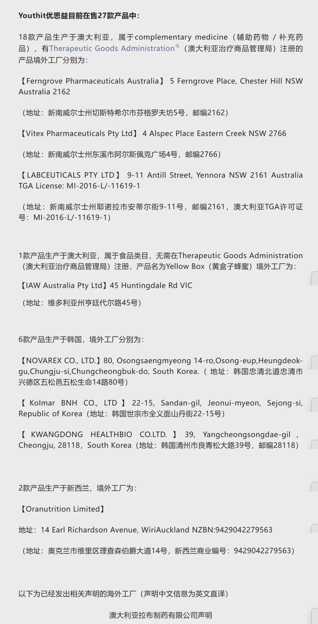 面对质疑,优思益在4月1日晚的声明中表示,第一代铁饮产品系授权国内营养品上市企业生产,但强调相关产品2025年起已转移到新西兰工厂进行生产。而对于核心的叶黄素产品究竟是否在澳洲生产,声明未给出直接回应。