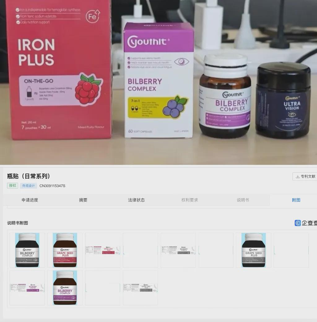 广州雅拉源旗下的专利信息也让人生疑。企查查的信息显示,目前广州雅拉源旗下有四项专利,均为外观专利,发明者均为公司法人黄驰。四项专利附图中都显示了优思益的英文名“Youthit”字样,为优思益产品的外包装设计图。其中,一项瓶贴的外观专利图,与媒体报道中显示的一款优思益产品外包装高度一致。