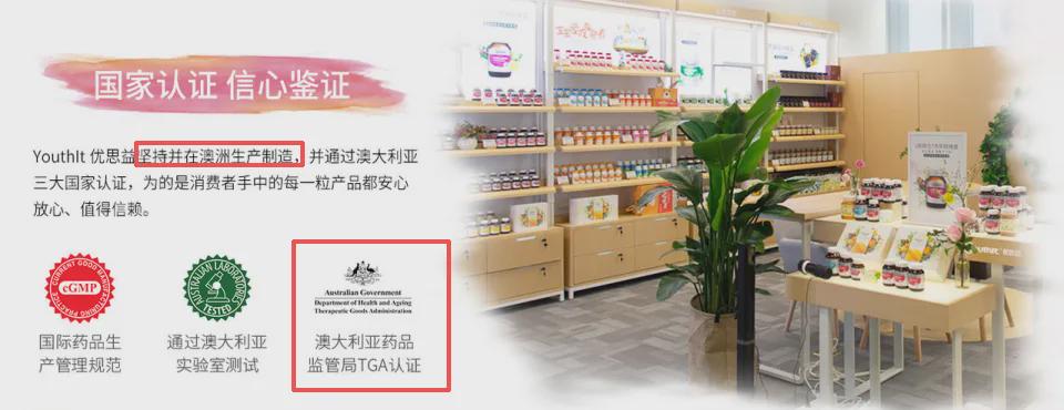 官网显示,优思益品牌所属公司为“Yarra Vibe Pty Ltd”,中文译名为“澳洲雅拉源健康产业有限公司”。官网上还有一句介绍:“Youthit优思益坚持在澳洲生产制造”,而且,其官网上还有澳大利亚治疗用品管理局TGA认证。
