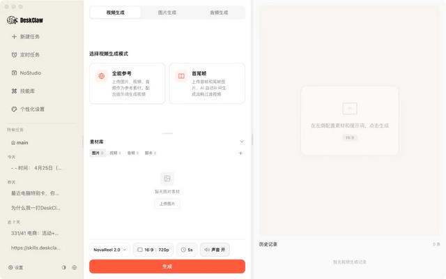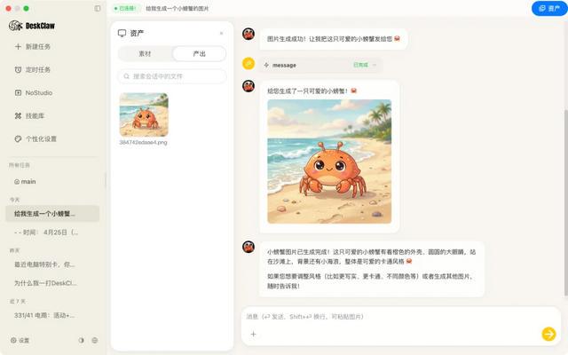 另外,“好工具必须融入用户原有的工作流,而不是强迫用户学习AI指令。”以DeskClaw的资产库功能为例,用户可以直接通过拖拽的方式使用素材,这完全符合电商从业者和内容创作者的直觉使用习惯。