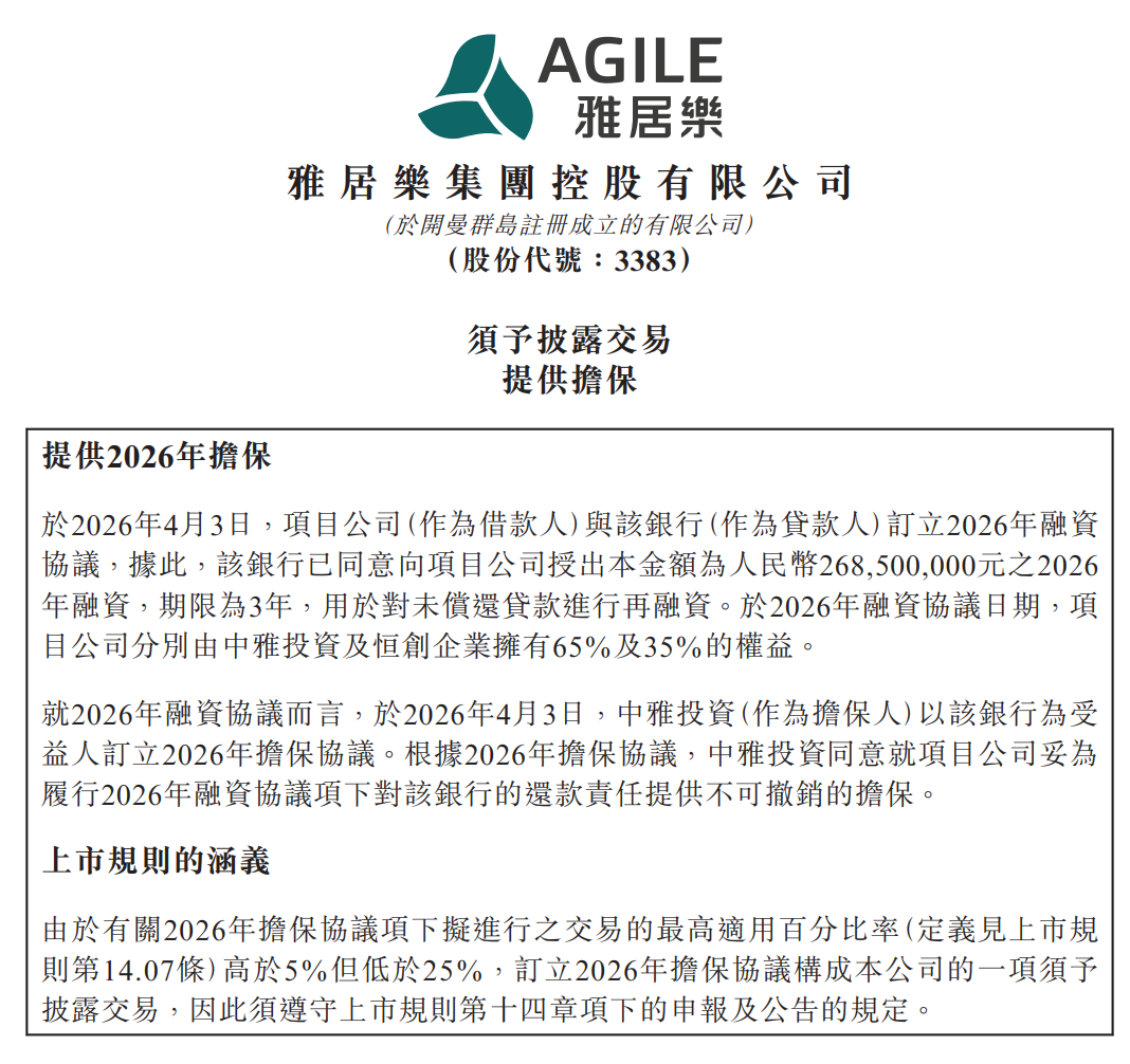 4月7日,雅居乐集团控股有限公司(03383.HK)公告披露,于2026年4月3日,项目公司(作为借款人)与中山农村商业银行股份有限公司石岐支行(作为贷款人)订立2026年融资协议。