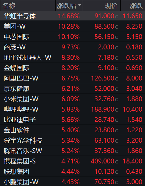 科网股全线走高,美团、中芯国际涨超10%,商汤涨超9%,阿里巴巴涨超6%,携程集团、联想集团涨超4%,腾讯控股、京东集团涨超3%,百度集团、网易涨超2%。