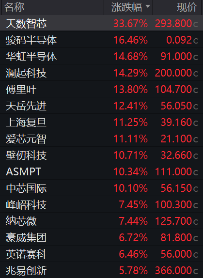 半导体板块强势领涨,天数智芯涨33%,华虹半导体、澜起科技涨超14%,上海复旦涨超11%,中芯国际涨超10%,纳芯微涨超7%,兆易创新涨超5%。