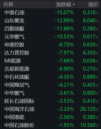 石油石化板块下跌,中港石油跌超15%,山东墨龙跌近13%,百勤油服跌超11%,中石化油服跌超4%。