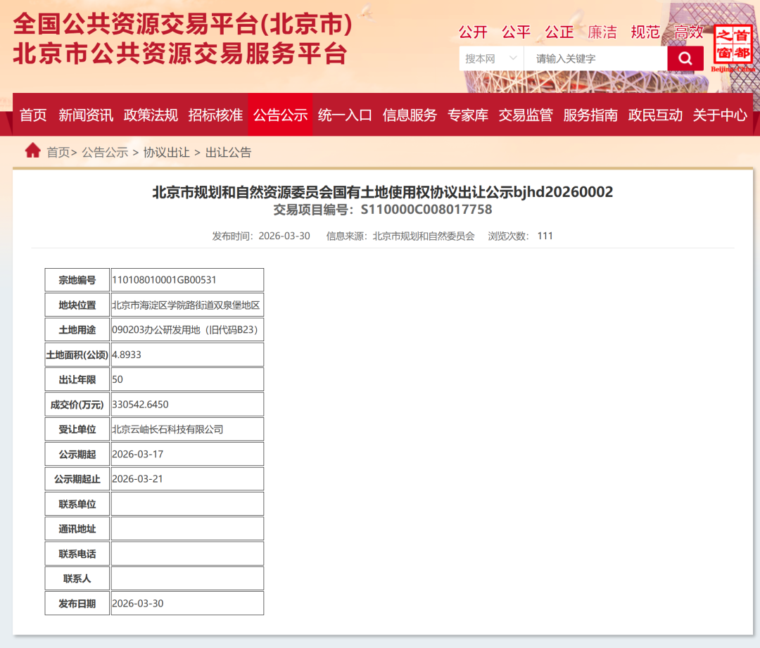 红星资本局4月8日消息,近日,北京市公共资源交易服务平台披露的信息显示,字节跳动全资控股的北京云岫长石科技有限公司以33.05亿元总价,成功受让海淀区学院路街道双泉堡地块。