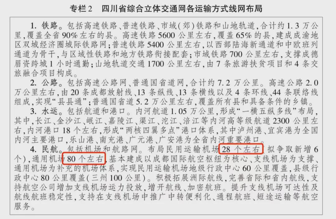 根据《四川省“十四五”综合交通运输发展规划》,到2035年,四川布局民用运输机场将达28个左右。