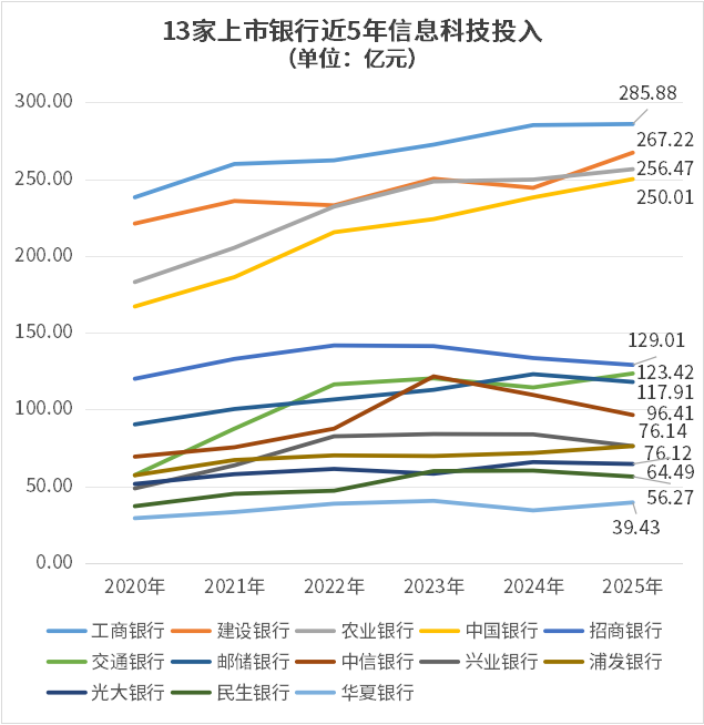 从数据来看,除了增速放缓,2025年还有多家银行投入较此前有所下降。招商银行经历了2022年141.68亿元的投入巅峰后,至2025年降至129.01亿元;邮储银行、民生银行近5年首次出现下滑,信息科技投入分别为117.91亿元、56.27亿元;中信银行、兴业银行均在2023年信息科技投入达到近5年高点,至2025年分别为96.41亿元、76.14亿元。