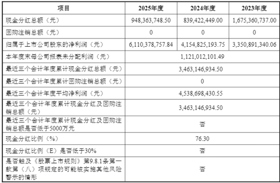 尽管业绩大幅增长,华友钴业2025年分红力度并未同步提升。公司近三年累计现金分红占年均净利润比例为76.30%,但当期分红占比明显下滑。