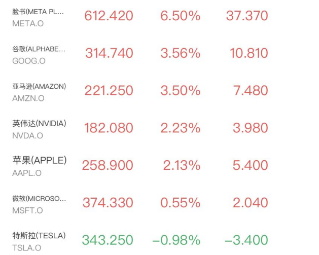 明星科技股表现不俗,科技巨头Meta 涨6.50%,公司发布Muse Spark人工智能模型。谷歌、亚马逊涨超3.5%,苹果、英伟达涨超2%,微软涨0.5%,特斯拉逆势下跌近1%。