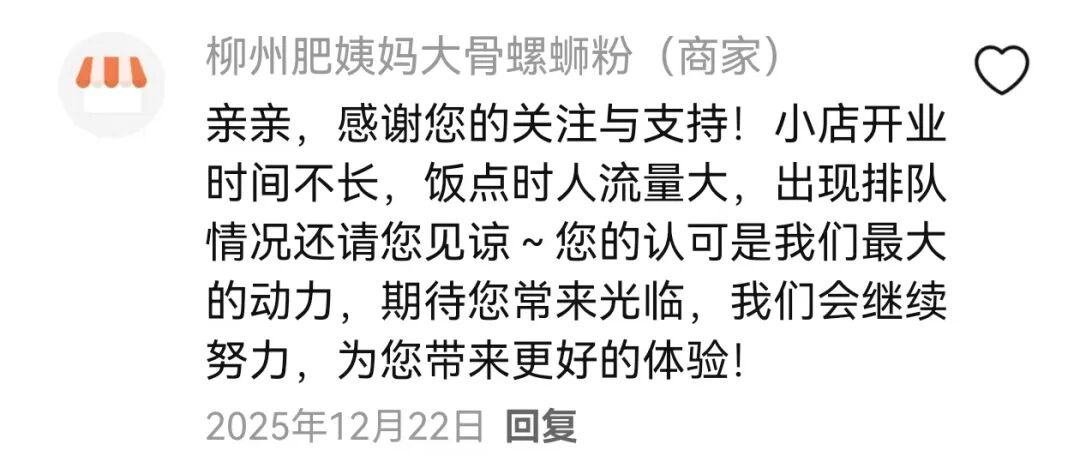 对于类似评论,商家曾回复:“小店开业时间不长,饭点时人流量大,出现排队情况还请您见谅”。
