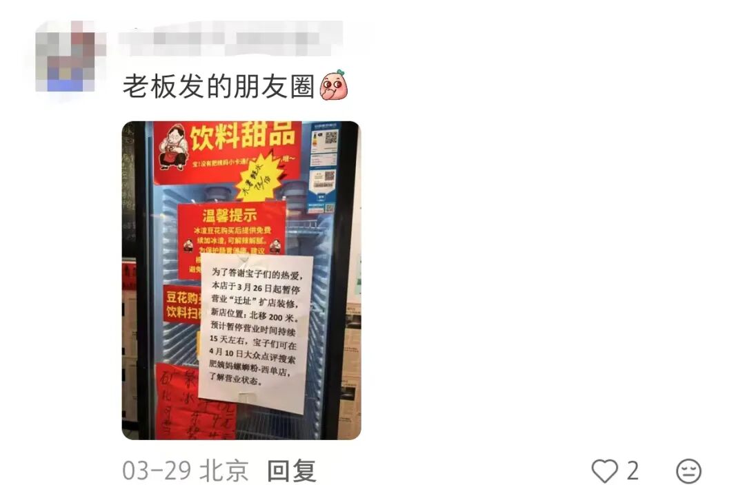 相关帖文下,有网友评论称:“挺好吃的呀”“盲猜到期涨房租或房租太贵想换个便宜点的地”。还有人晒出照片,称老板发了朋友圈,店铺此次关闭是为了“迁址”。