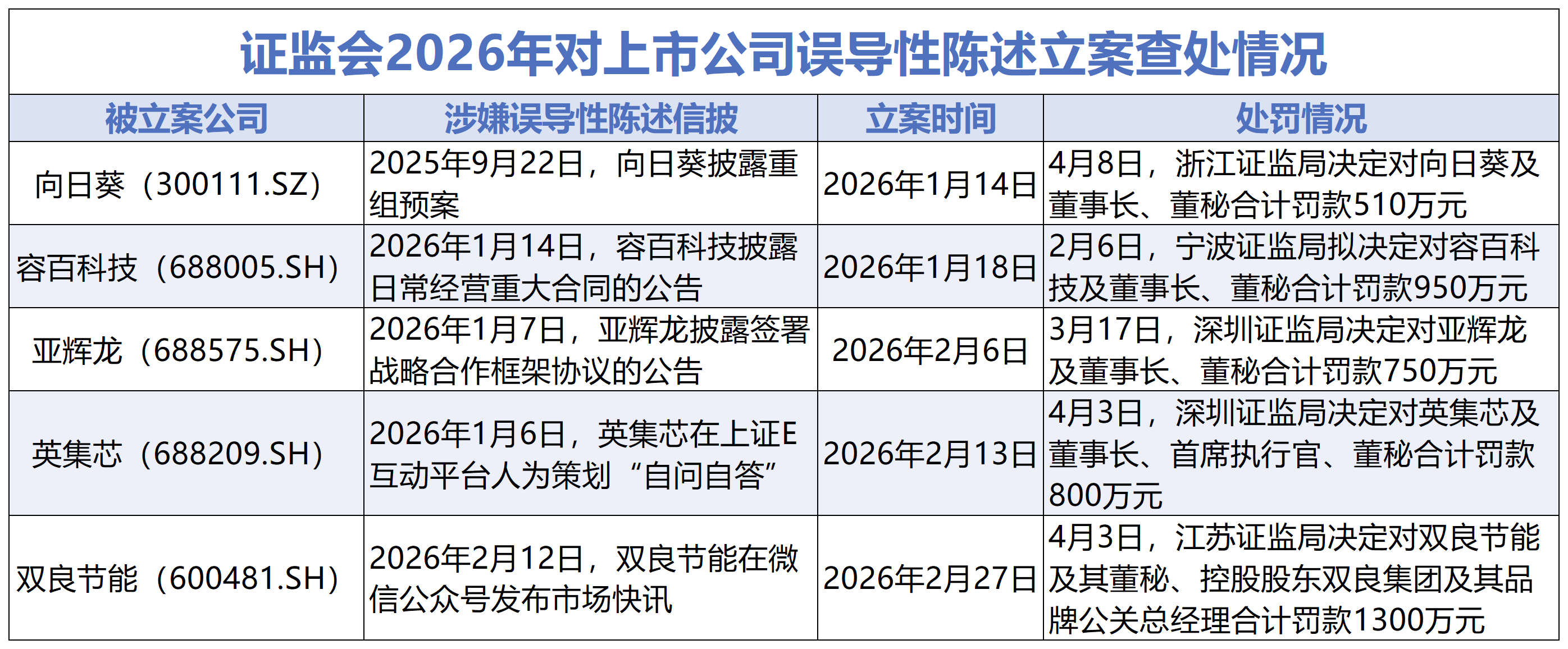 至此,2026年年内因涉误导性陈述被立案的5家A股公司已有4家收到《行政处罚决定书》,其余1家收到《行政处罚事先告知书》。5张罚单合计4310万元。
