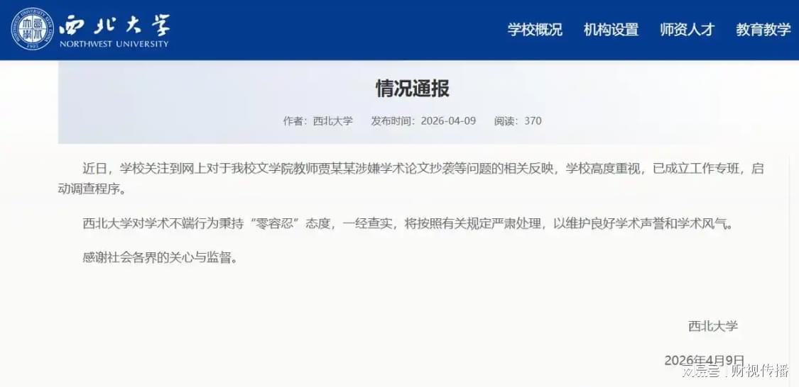 2026年4月9日,西北大学发布情况通报,就网传该校文学院教师贾某某涉嫌学术论文抄袭等问题作出回应。通报称,学校对此高度重视,已成立工作专班,正式启动调查程序。