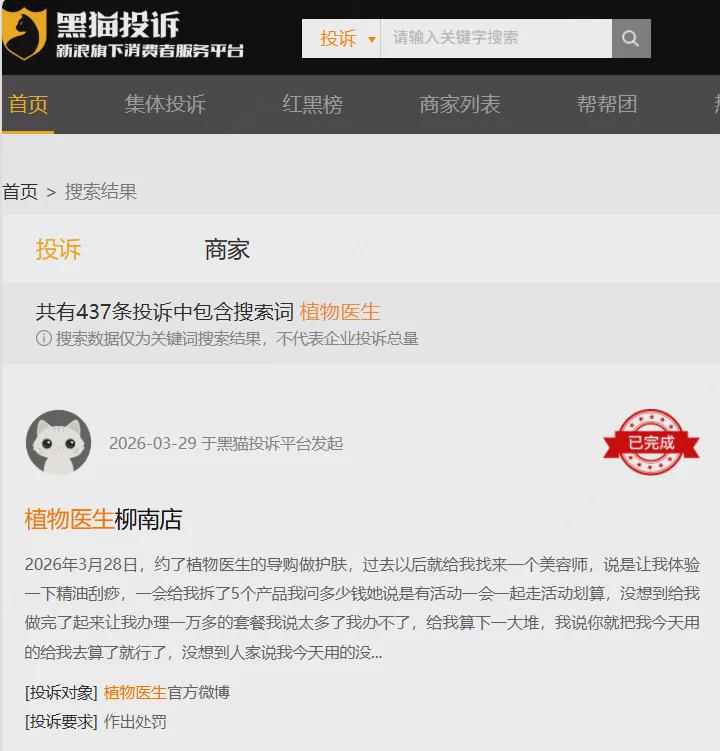 如果说供应链端的疑问尚可归结为商业运作的复杂性,那么终端的合规乱象与品控漏洞,则直接动摇了品牌的信任根基。在黑猫投诉平台上,关于植物医生的投诉已高达400多起,涵盖产品质量引发健康问题、临期产品售卖、虚假宣传与服务违约等类别。