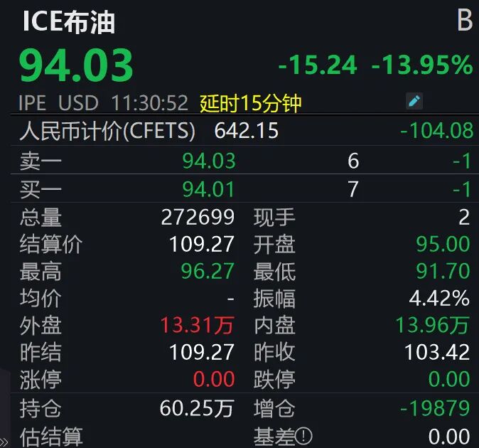 与黄金强势形成鲜明对比,国际原油期货市场当日遭遇重挫。截至发稿,WTI原油暴跌16.18%,报94.67美元/桶,盘中最低触及91.05美元/桶;布伦特原油期货同步跳水13.95%,报94.03美元/桶,盘中最低触及91.7美元/桶。