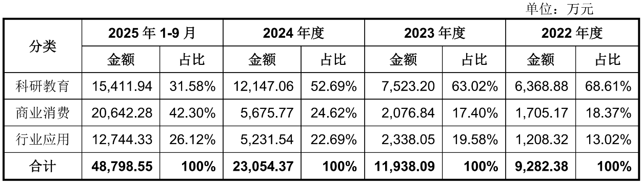 但宇树2023年发布的人形机器人,则尚未实现市场结构的扭转。根据招股书,宇树人形机器人2025年前三季度,科研教育收入占比73.60%,工业场景占比9%;商业消费占比17.39%。