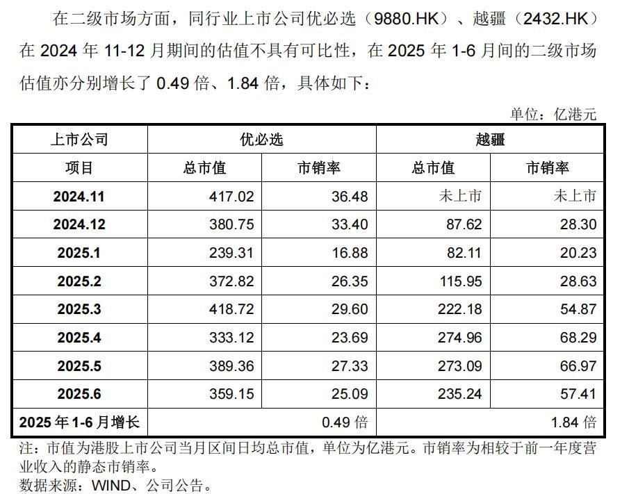 宇树科技在第一轮审核问询函回复文件中所列示的2025年1-6月同行业二级市场估值增长数据显示,仅优必选、越疆两家企业,且优必选同期的二级市场估值增长幅度仅0.49倍,大幅低于宇树科技同期估值增长幅度。