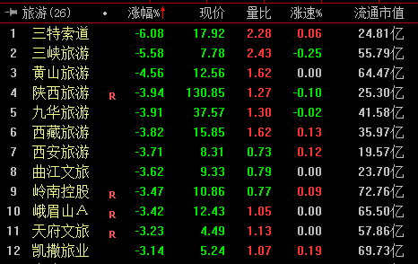 旅游板块集体下跌,三特索道、三峡旅游跌超5%,陕西旅游、九华旅游等多股跌逾3%。