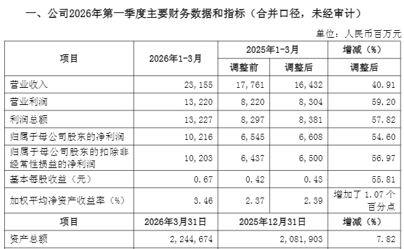 4月9日,中信证券股份有限公司(下称“中信证券”,600030.SH,06030.HK)发布《2026年第一季度业绩快报公告》指出,2026年一季度,公司实现营业收入231.55亿元,同比增加40.91%;实现归属于母公司股东的净利润(下称“净利润”)102.16亿元,同比增加54.60%。