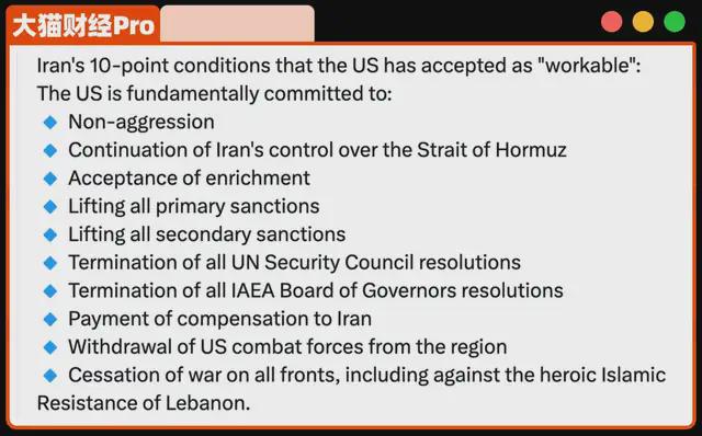 美伊互不侵犯、伊朗实控海峡、结束包括黎巴嫩真主党在内的战争、美国从海湾撤军、赔偿伊朗、接受铀浓缩、解除一级和次级制裁、撤销原子能机构协议、撤销安理会决议。