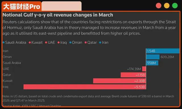 3月份,战事正酣,海湾国家应该输麻了,事实上,小国确实输麻了,但是也有人赚翻了,油价大涨,伊朗的石油收入同比增长37%,阿曼增长26%,沙特阿拉伯增长4.3%。