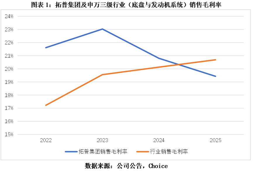 在2025年,拓普集团的毛利率水平已经弱于行业。根据申万三级行业(底盘与发动机系统)分类,行业平均毛利率从2024年的20.13%提升至2025年的20.63%,而拓普集团毛利率却从2024年的20.8%降至2025年的19.43%。在行业整体盈利改善的背景下,公司毛利率不升反降,且与行业平均水平的差距从+0.67个百分点逆转为-1.20个百分点。