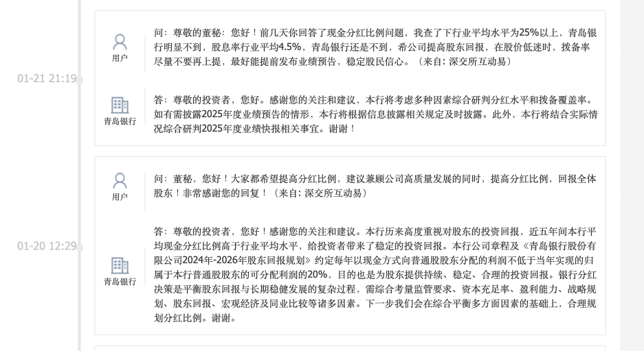 今年年初,就曾有投资者在互动易上向青岛银行董秘建议提高分红比例。彼时,青岛银行给出了“近五年间本行平均现金分红比例高于行业平均水平”的回复。