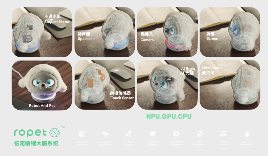 陪伴产品到底要怎么做?这是行业的核心问题。何嘉斌的答案是,负担要低、情绪给够。比如,ropet的传感器会模拟猫狗的反应,“如果它喜欢你,会盯着你看;摸它会积累亲密度;时间长了能通过人脸识别记住你,并用不同的音调回应。”