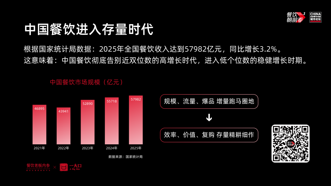根据国家统计局数据:2025年全国餐饮收入达到57,982亿元,同比增长3.2%。这个数字意味着,中国餐饮行业已经彻底告别了从前近两位数增长的高歌猛进时期,进入了低个位数增长的稳健时期。