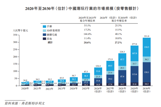 中国潮玩行业近年来呈现迅猛增长态势。数据显示,行业零售额从2020年的249亿元飙升至2025年的875亿元,复合年增长率高达28.6%。同时,行业规模预计从2026年的1264亿元进一步增长至2030年的3310亿元,复合年增长率维持在27.2%高位。