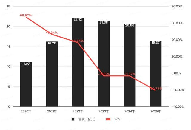 其中,去年营收下滑幅度更是远超2023年和2024年的约3%,达到了20.74%。