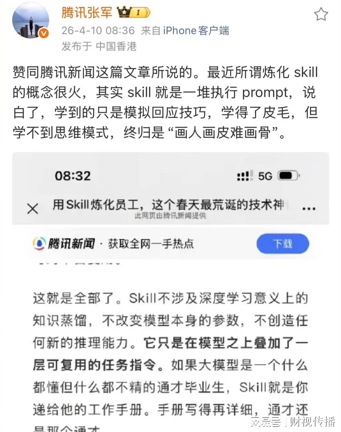 4月10日,腾讯公关总监张军发声,直指近期火热的“Skill炼化”概念本质仍停留在Prompt层——通过预设指令与示例优化输出形式,但并未触及模型参数与推理能力,难以形成真正的“思维能力”,更接近“画皮难画骨”。